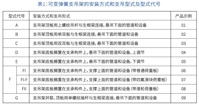 我公(gōng)司生産的可(kě)變彈簧支吊(diào)架采用的标(biāo)準主要是NB/T 47039-2013及(jí)其它相💯關标(biāo)準。按安裝方(fāng)式和支吊型(xing)式不同可分(fen)爲A、B、C、D、E、F、G共7種型式(shì)(見表1)